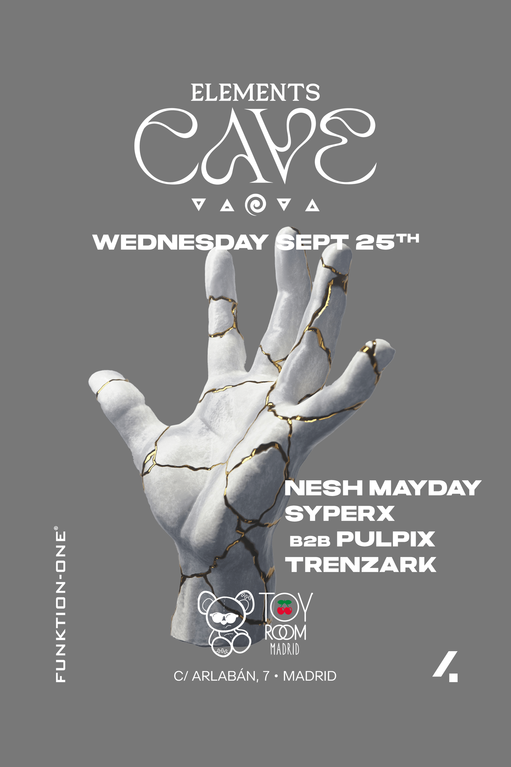 Elements Cave is back at Toy Room Madrid, located at C. de Arlabán 7, 28014 Madrid, on Wednesday, September 25th, 2024. The event starts at 23:59 and runs until 05:00.